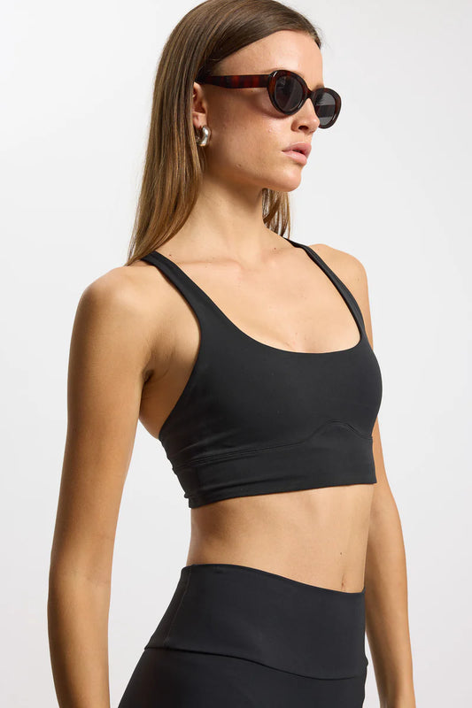 Sports-bh med krydsede stropper og udtagelige indlæg. Den har et bredt taljestykke med elastik indeni...