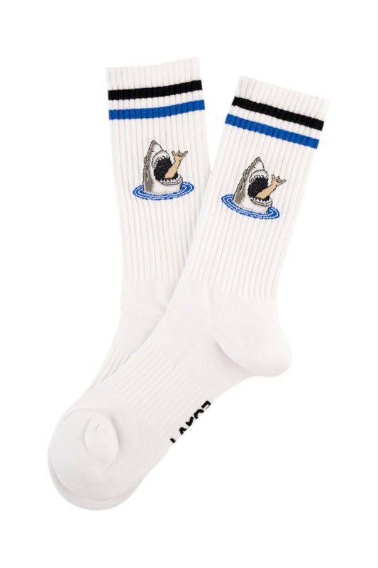 Disse hvide strømper kombinerer et sporty udtryk med et humoristisk twist. Det ribstrikkede skaft med...