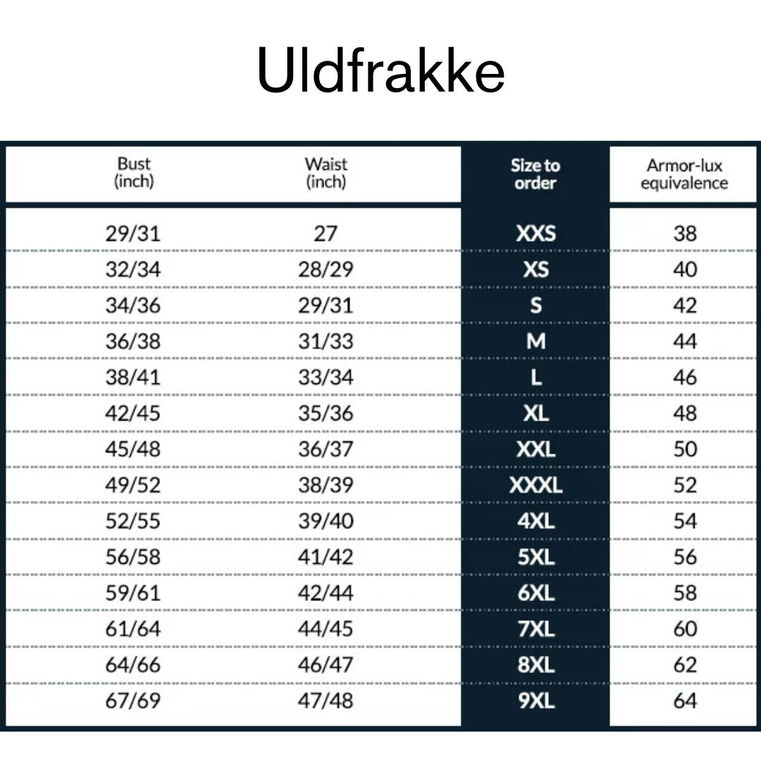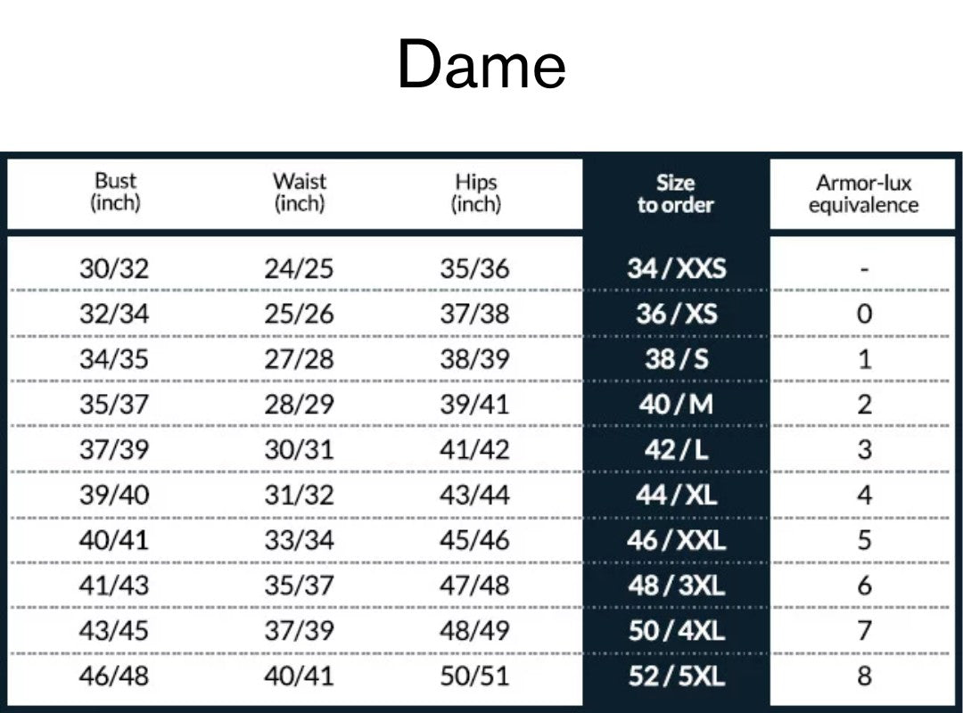 Armor Lux er et fransk mærke, hvorfor størrelserne er opgjort i tommer.