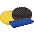 Sættet indeholder: 1 stk. Gul vaflet skum rubbingrondel, Ø180 mm 1 stk. Sort vaflet skum voksrondel, Ø180 mm 1 stk. Mikrofiberklud 40 x 38 cm
