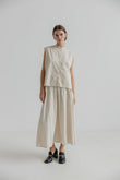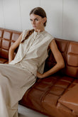 Denne minimalistiske skjorte er designet med et moderne touch, der kombinerer enkelthed og elegance. Den neutrale tone og ærmeløse stil gør skjorten til et tidløst stykke, som nemt kan styles til enhver anledning. Perfekt til både afslappet og formelt brug.