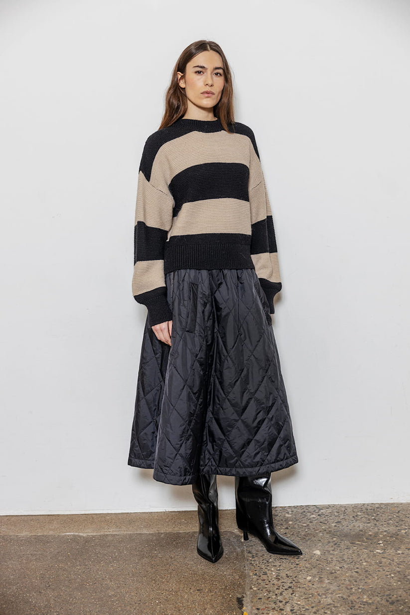 Strikken er strikket i Italien i en varm og behagelig blanding af alpakauld, viskose og polyamid. Designet med dropped shoulders, brede ærmer og en let cropped længde, der giver et afslappet og moderne udtryk. De markante striber skaber kontrast og personlighed i det ellers enkle design.