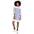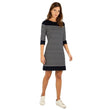 Den har trekvarte ærmer, rund hals og er knælang.