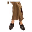 Den er udstyret med et kromfrit læderfoer og en let sort tunitsål med en dekorativ rand, der tilføjer et elegant touch. Den øverste del af skoen er lavet af naturligt, vegetabilsk garvet læder og er håndvævet i Indien, hvilket gør hvert par helt unikt – farve og mønster kan variere.