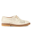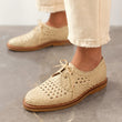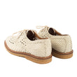Disse håndflettede snøresko er udstyret med en blød rågummisål, der tilbyder komfort og fleksibilitet. Deres runde snude og polstrede læderindersål sikrer en behagelig pasform, mens den justerbare snørelukning giver mulighed for tilpasning efter individuelle præferencer. Den lette sål, lavet af fornybart naturgummi, er dekoreret med kontraststikninger for et stilfuldt udtryk.