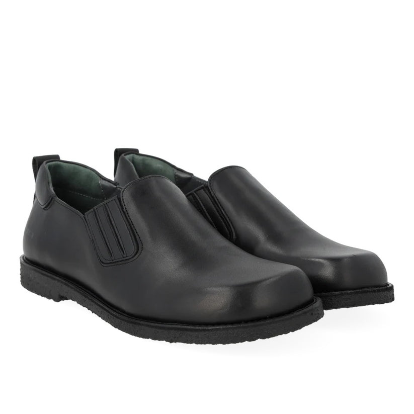 Enkel og tidløs lædersko med rummelig pasform, perfekt til dig der ønsker komfort hele dagen. Skoen har en rundet snude og funktionel elastik ved vristen, som gør den nem at tage af og på. Et præget logo ved hælen tilføjer et diskret brandudtryk.
