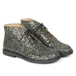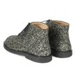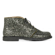 Denne ørkenstøvle, skabt med en rummelig pasform, skinner med funklende glitter. Den har en rund snude, en justerbar snørelukning, ruskindskanter, en vatteret indersål og et læderfor, der tilføjer komfort og stil. Støvlen er færdig med en blød og fleksibel sort rågummisål lavet af fornybart naturgummi.