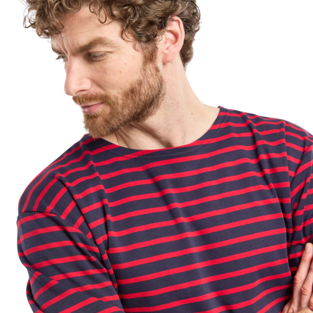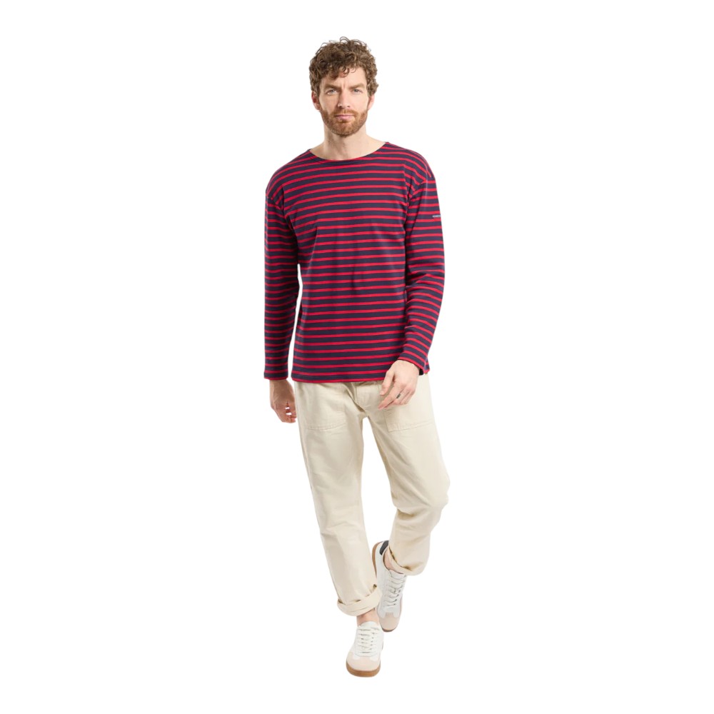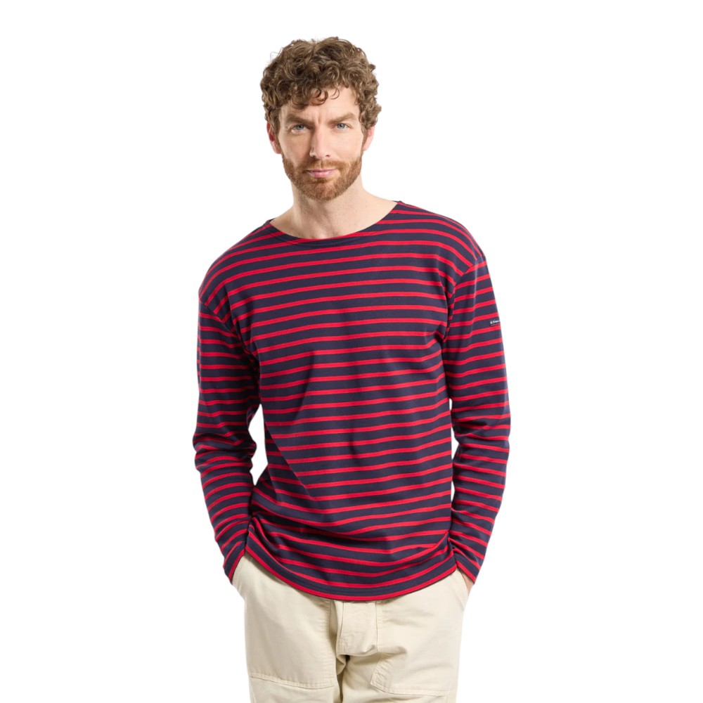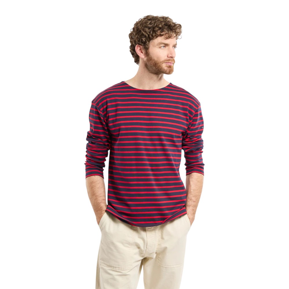 Denne udgave er fremstillet i blød interlock-bomuld, som giver en behagelig og slidstærk kvalitet med et glat, fleksibelt strik. Den har bådhals, lange ærmer og de karakteristiske Breton-striber, der giver et autentisk maritimt udtryk.