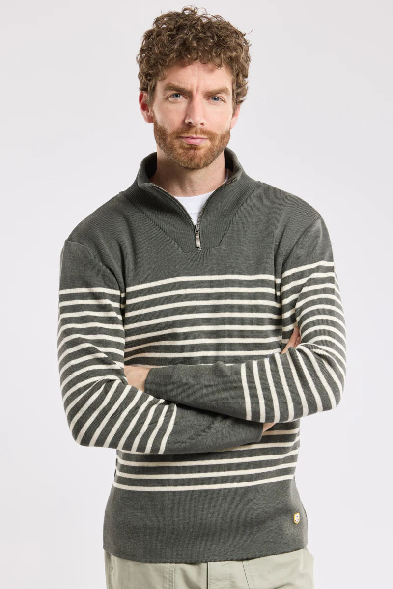 Denne zip-neck strik fortolker den klassiske maritime stil med et moderne og elegant udtryk. De tidløse striber og det afslappede snit gør den til et sikkert valg i enhver herregarderobe – perfekt til både hverdag og weekend.