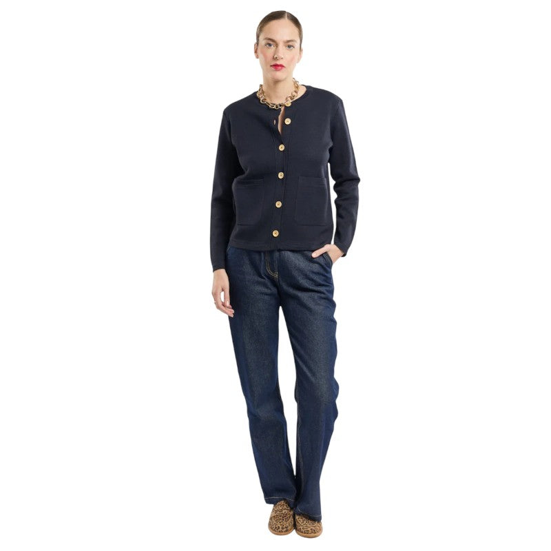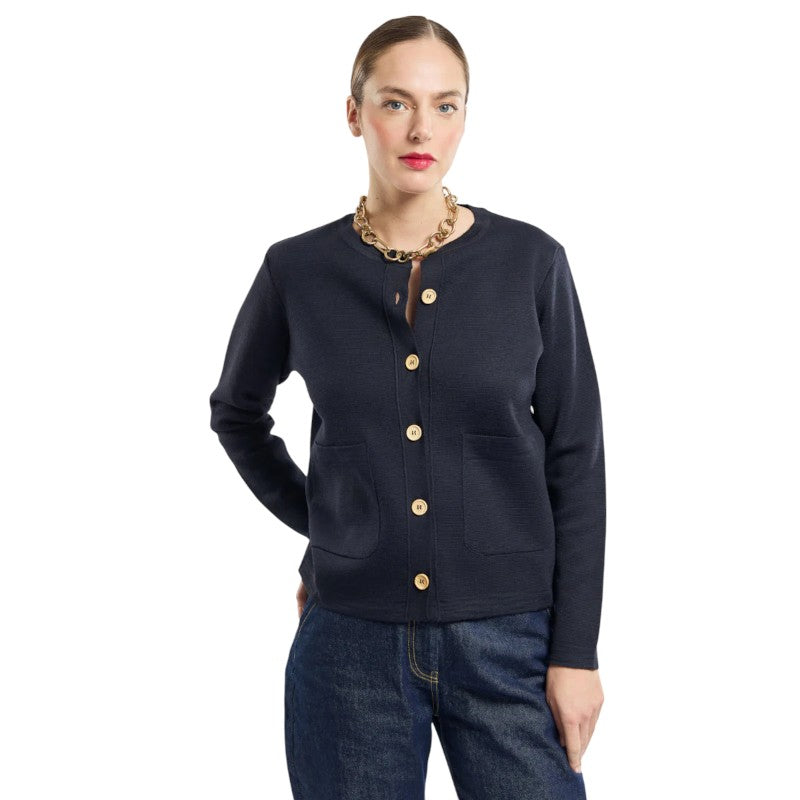 Tilføj et hyggeligt og elegant touch til din garderobe med denne cardigan i Milano-strik. Den kan bæres lukket for et klassisk look eller åben for en mere afslappet stil. De fine træknapper og de praktiske forlommer giver designet både charme og funktionalitet.