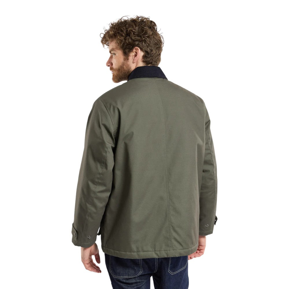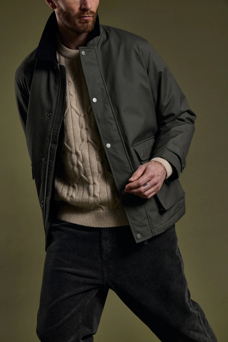 Den er fremstillet i vandafvisende bomuldscanvas, som beskytter mod let regn og vind. Designet har skjult lynlås med trykknapper, to praktiske frontlommer, en inderlomme med trykknap, samt velourdetalje i kraven, der tilføjer et eksklusivt touch. Justerbare manchetter sikrer en perfekt pasform.