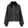 Den rå, eksponerede metallynlås med stort ringtræk står i smuk kontrast til den bløde, fløjlsbeklædte krave, og den diskrete brystlomme med lynlås giver et funktionelt touch uden at forstyrre det rene design.