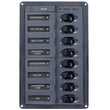 Med 8 kontakter/automatsikringer der kan klare 12V, svag grøn LED belysning bag labels og rød LED kontrol lys ved kontakt on.