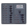 Med 12 kontakter/automatsikringer der kan klare 12V, svag grøn LED belysning bag labels og rød LED kontrol lys ved kontakt on.