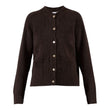 Denne klassiske knap-op-cardigan i en dyb chokolademelange kombinerer tidløs elegance med varm komfort.