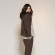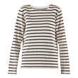 Denne tidløse, stribede bluse forener et klassisk maritimt snit med en varm chokoladebrun nuance på en ecru-bund. Fremstillet i blød, let jersey-kvalitet, der ligger behageligt mod huden og bevæger sig med kroppen.