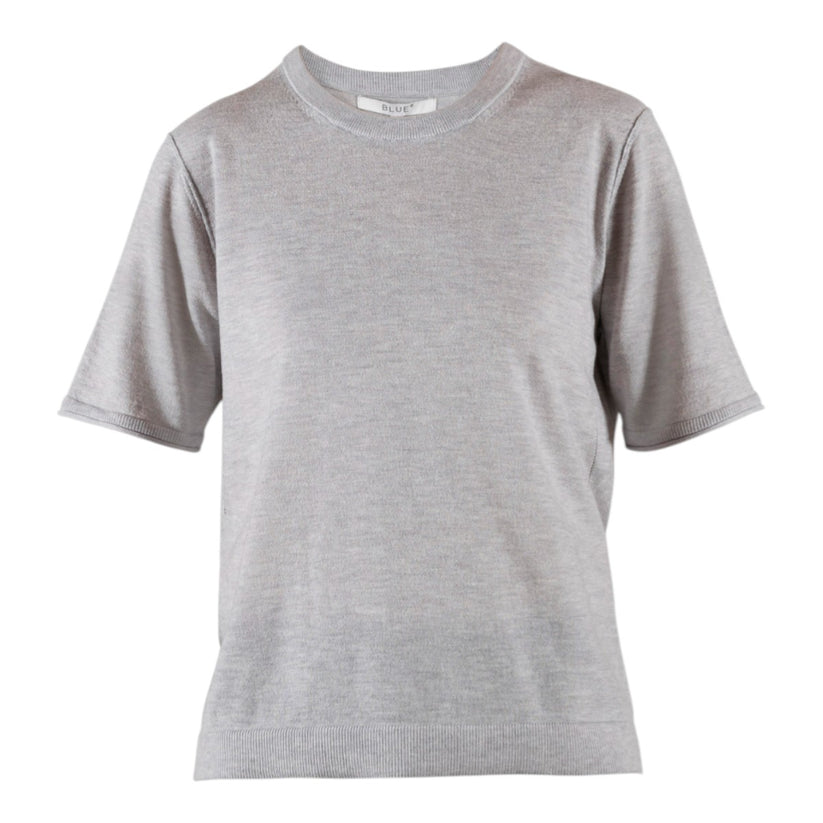 Denne minimalistiske, kortærmede trøje i en lys silvergrey melange er udført i en fin, glat strik for et rent, skandinavisk udtryk.