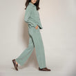 Denne afslappede buksemodel i en afdæmpet støvet grøn farve er designet til maksimal komfort uden at gå på kompromis med stilen.