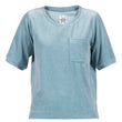 Det unikke ved denne t-shirt er dens velourlignende tekstur og den enkelte brystlomme, der tilføjer et moderne touch til det simple design.
