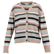 En elegant stribet cardigan i smukke pastelfarver som blå, pink, sort og beige.