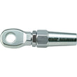 Valsefri øjeterminal af rustfri stål fra Blue Wave. En terminal bruges til at holde fast i enden af en stålwire, således at wiren kun kan bevæge sig i én retning.