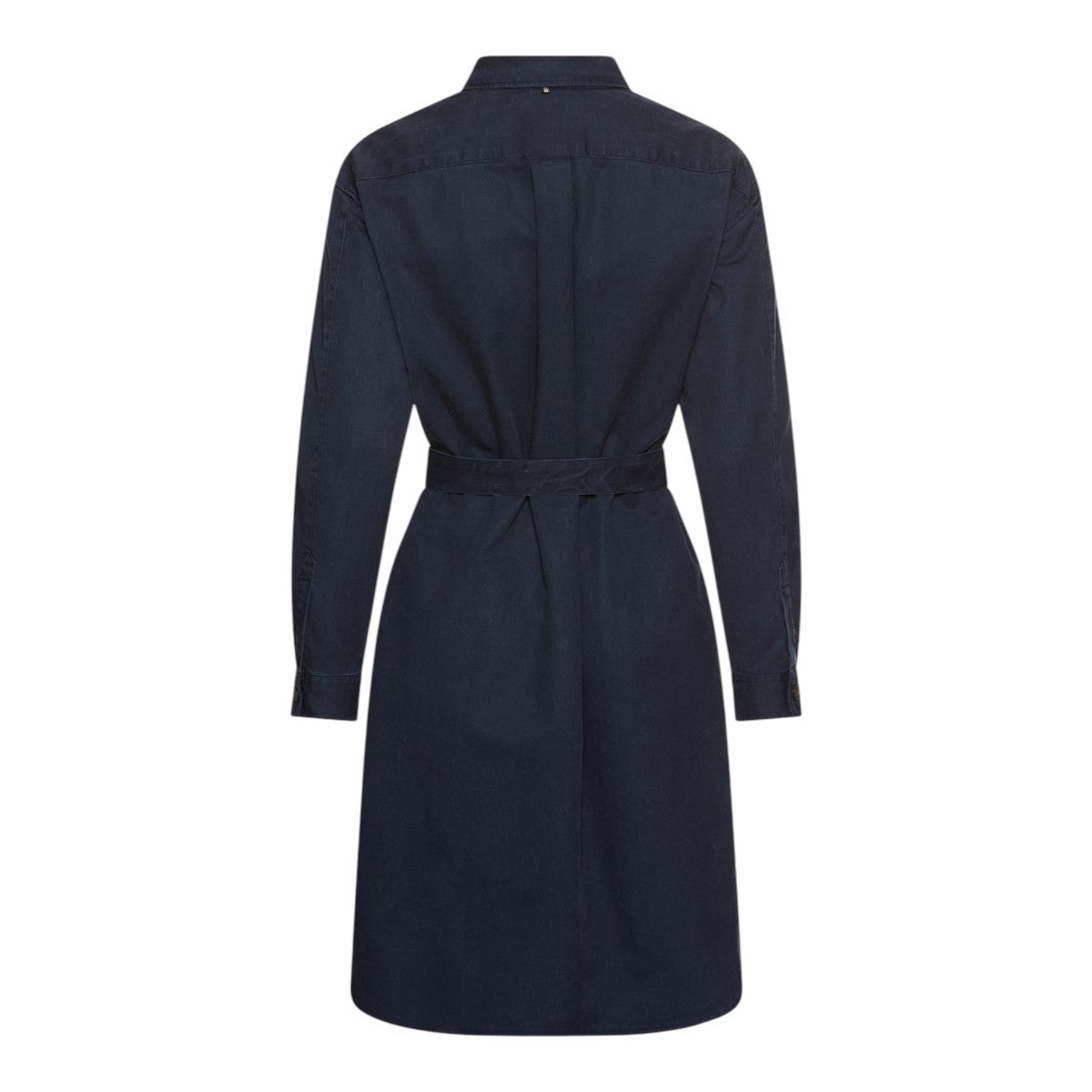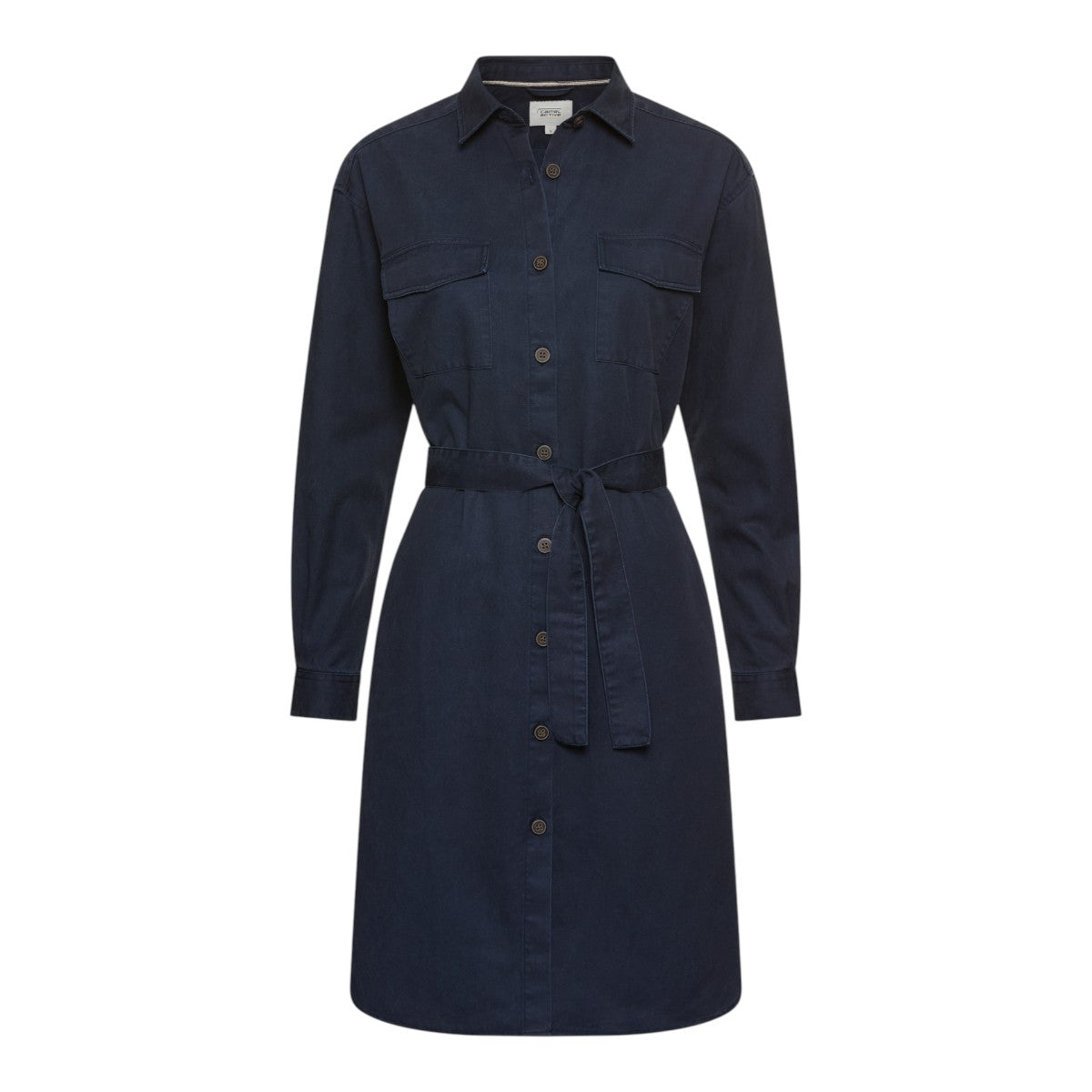 Denne klassiske skjortekjole i dyb marineblå kombinerer den rene, tidløse silhuet fra en skjorte med kjolens elegante femininitet.