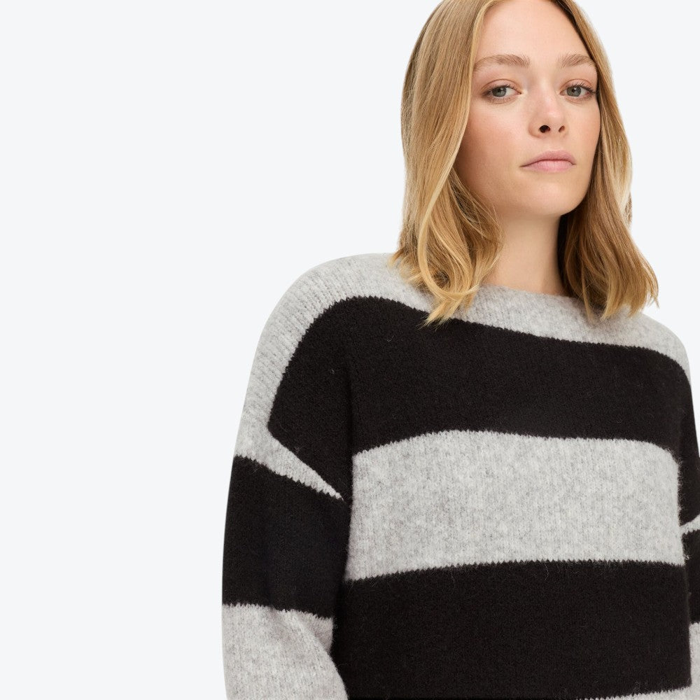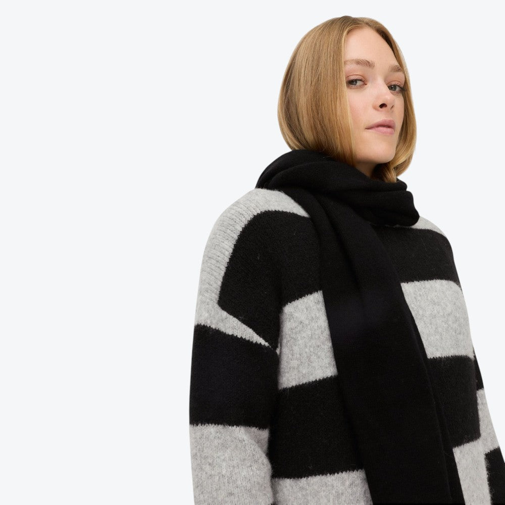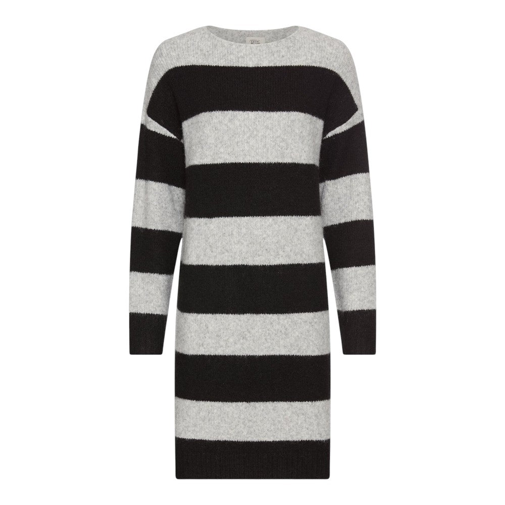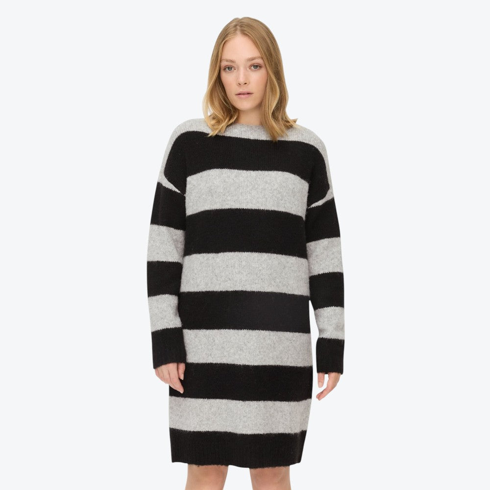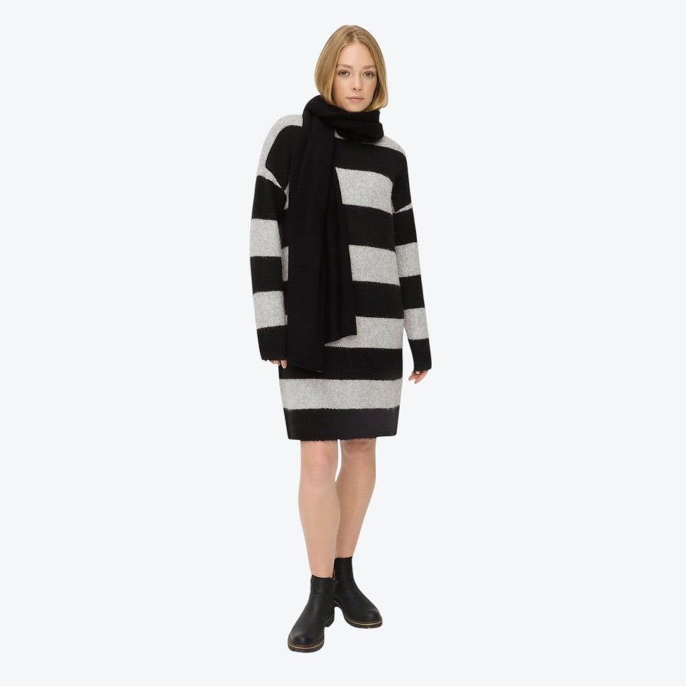 Denne afslappede strikkjole fra Camel Active kombinerer komfort og stil på elegant vis. De brede blokstriber og det blødt faldende snit giver kjolen et moderne og ubesværet udtryk, perfekt til hverdagen. Den runde hals skaber balance i designet, mens det elastiske mischgarn med genanvendt materiale sikrer en behagelig pasform og let fornemmelse mod huden.