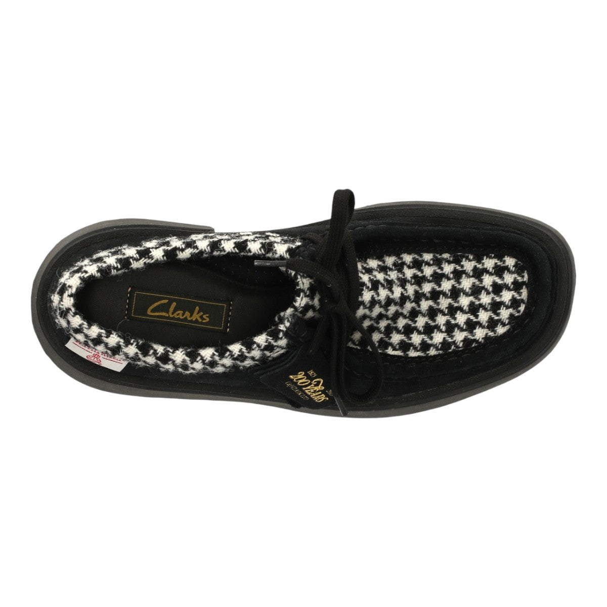 Clarks Wallabee-sko i sort ruskind med klassiske detaljer og eksklusivt Harris Tweed-stof omkring åbningen. Denne limited edition-model kombinerer Clarks’ ikoniske håndværk med britisk tekstilarv og markerer Clarks’ 200-års jubilæum.