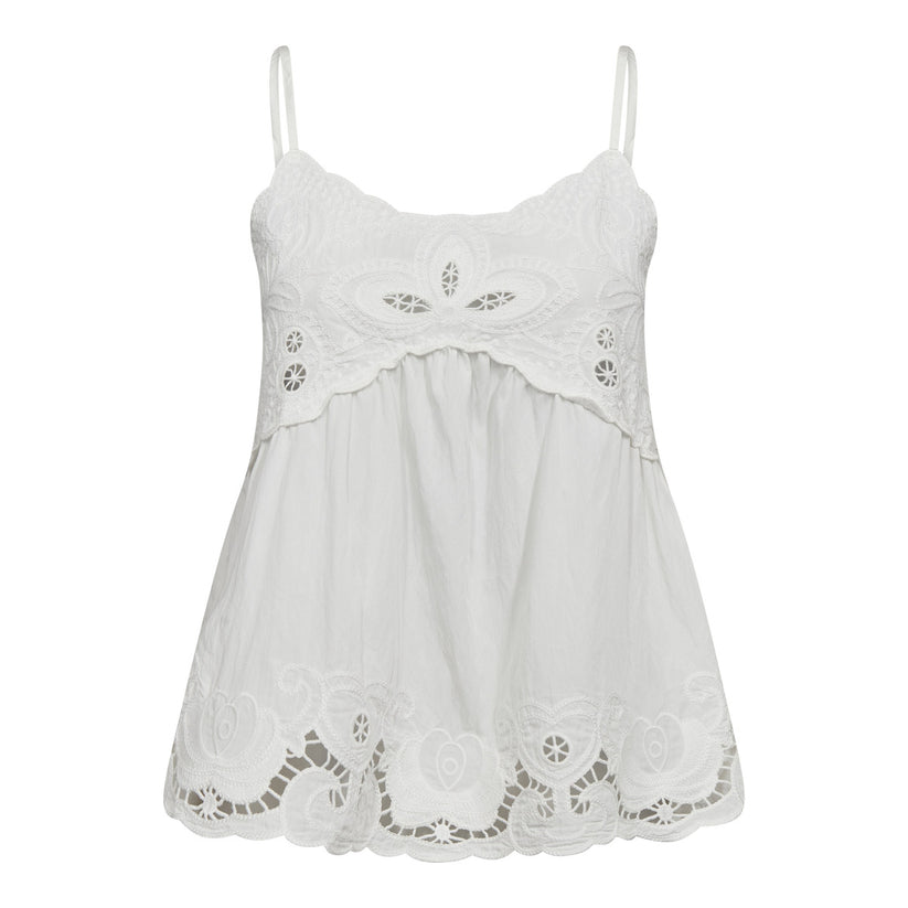 Denne hvide singlet er fremstillet af 100% bomuld, hvilket sikrer en behagelig og åndbar oplevelse. Den er designet med fine broderede detaljer, der tilføjer et elegant og feminint udtryk til din garderobe.