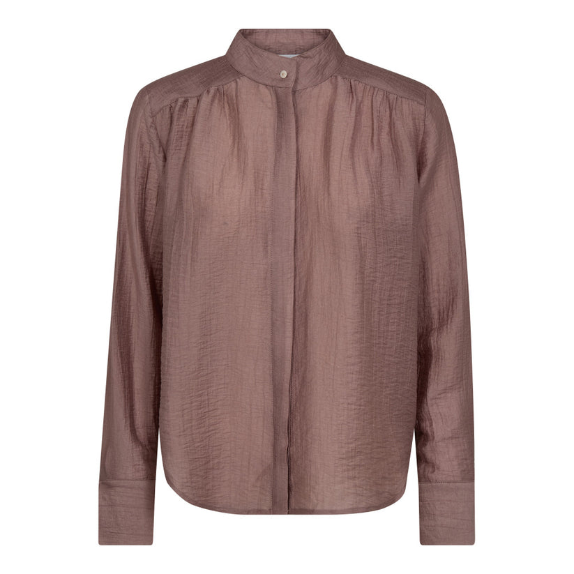 Denne skjorte har et elegant og roligt udtryk med sin lette struktur og bløde fald. Den høje krave med skjult knaplukning giver et raffineret look, mens de fine rynkedetaljer ved skuldrene tilfører et diskret feminint præg. Skjorten falder løst om kroppen og fungerer perfekt både til et stilrent hverdagsoutfit og til mere pæne anledninger.