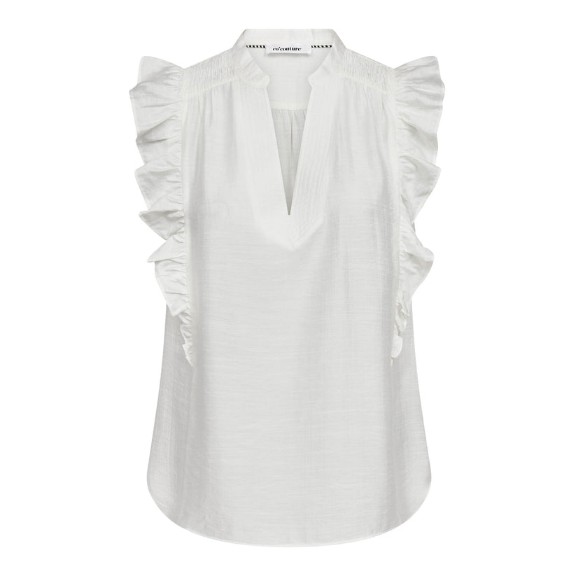 Denne hvide top er fremstillet af en blanding af 80% viskose og 20% polyamid, hvilket giver en let og behagelig kvalitet. Toppen er designet med en V-udskæring, der tilføjer et feminint touch til det enkle design.