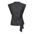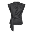 En elegant, draperet top med markeret talje. Stoffet falder smukt over kroppen og har en diskret, vævet struktur, der giver et eksklusivt udtryk. Den brede bindedetalje i siden former silhuetten, mens de lette, cap-ærmelignende skuldre gør toppen perfekt til både kontor og aften.