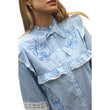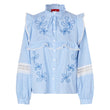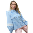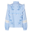 Denne skjorte kombinerer elegance med smukke detaljer. Den har en høj hals med sløjfelukning og flæsekant ved skuldrene, bryst og ryg.