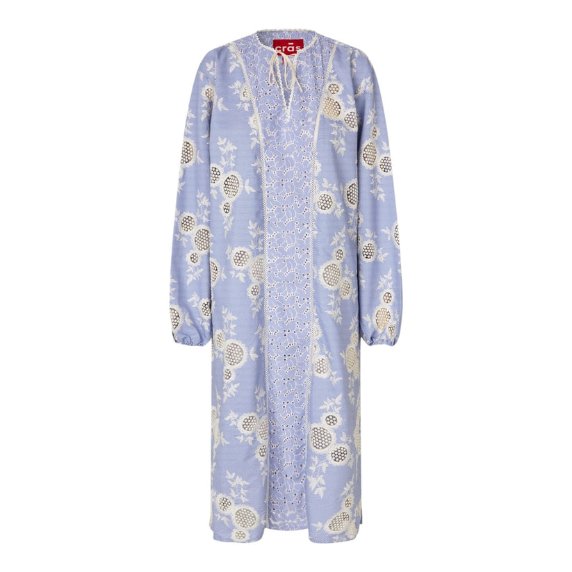 Denne afslappede og elegante kjole har lange, løse ærmer og en let, luftig pasform, der gør den ideel til både hverdagsbrug og ferier. Kjolen har midi-længde, fine detaljer og et broderet mønster, der tilføjer et sofistikeret præg.