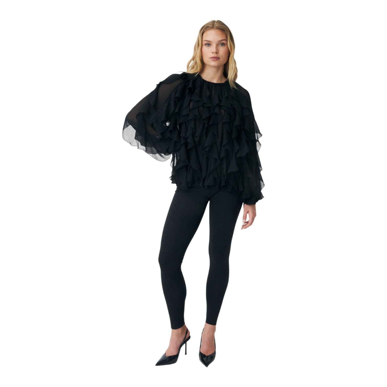 De lange ballonærmer samles smukt ved manchetterne med knaplukning, hvilket fremhæver blusens graciøse silhuet. En tidløs stil, der fungerer lige godt til festlige lejligheder som til hverdagen, hvor du ønsker et raffineret touch.