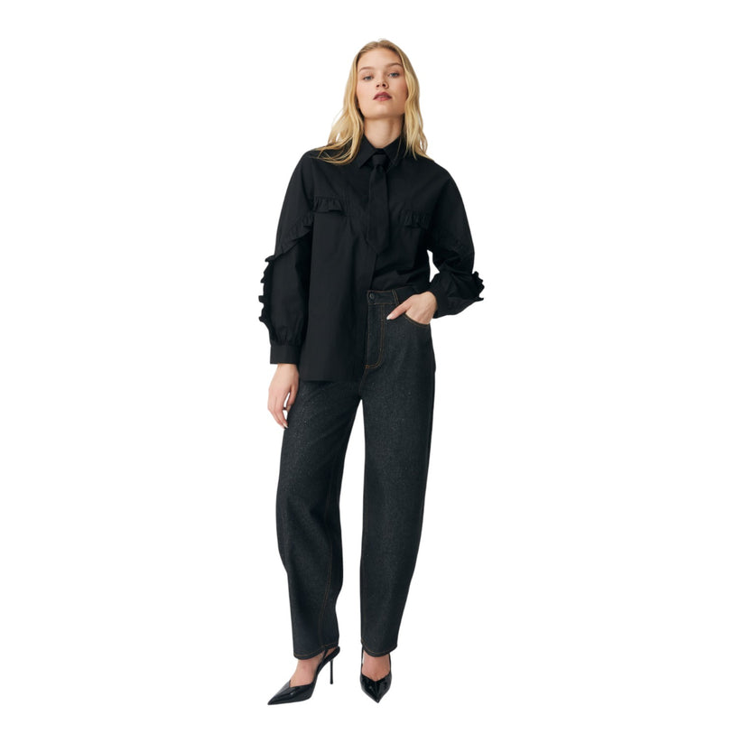 Tiecras Skjorte forener klassisk sort elegance med et legende og moderne twist. Den oversize silhuet skaber et afslappet og cool udtryk, mens de fine flæsedetaljer over brystet og ærmerne tilfører et feminint touch.