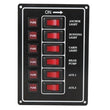 Sortlakeret aluminiums el-panel med 6 kontakter til 12V, belyste vippekontakter og 6 sikringer