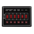 Sortlakeret aluminiums el-panel med 6 kontakter til 12V, belyste vippekontakter og 6 sikringer