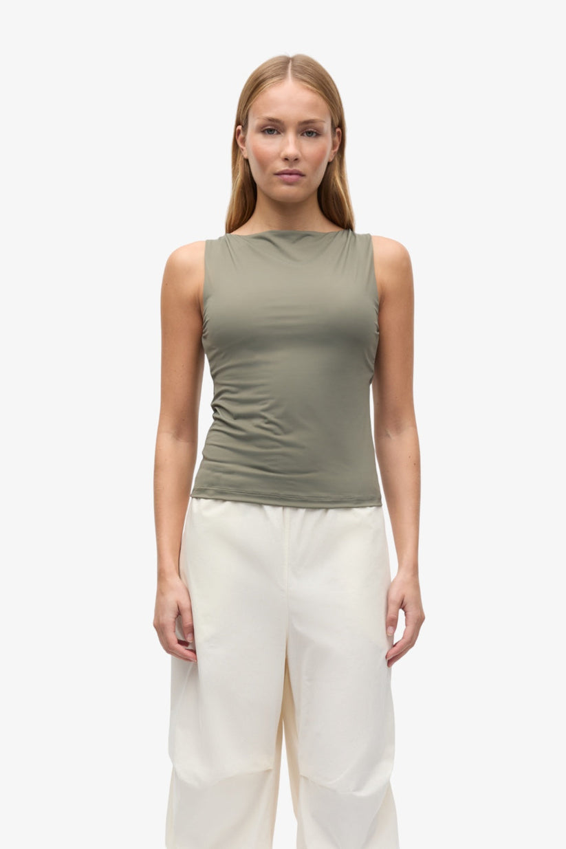 Ærmeløs top med stretch. Superblødt stof med stretch. Lidt bredere rund halsudskæring. Tvillingesøm forneden. Delvist foret. Slank pasform.
