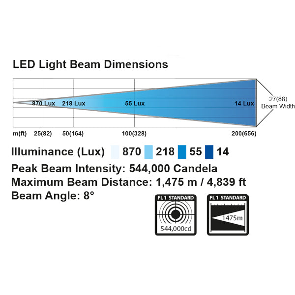 · Lyser op til 1400 meter med 0,25lux (0,25lux svarer til en klar nat med fuldmåne)
