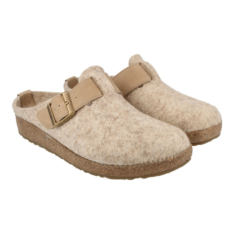 En komfortabel og stilren slip-on, der kombinerer naturlige materialer med et tidløst design. Overdelen er fremstillet i blød filt, som føles lun og behagelig mod foden og gør modellen ideel til både indebrug og afslappede dage derhjemme. Den brede, justerbare rem med metalspænde giver et eksklusivt udtryk og sikrer en personlig pasform.