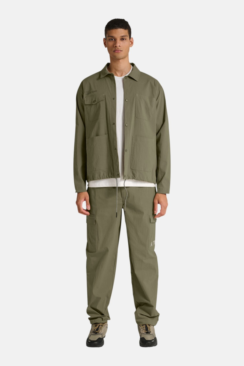 Skjorten har et klassisk design med krave og gennemgående knaplukning, kombineret med praktiske cargolommer, der giver et funktionelt look. Den justerbare snøre i bunden gør det muligt at tilpasse pasformen, mens det broderede HALO-logo og ATW-grafikken fuldender det minimalistiske og tekniske design.