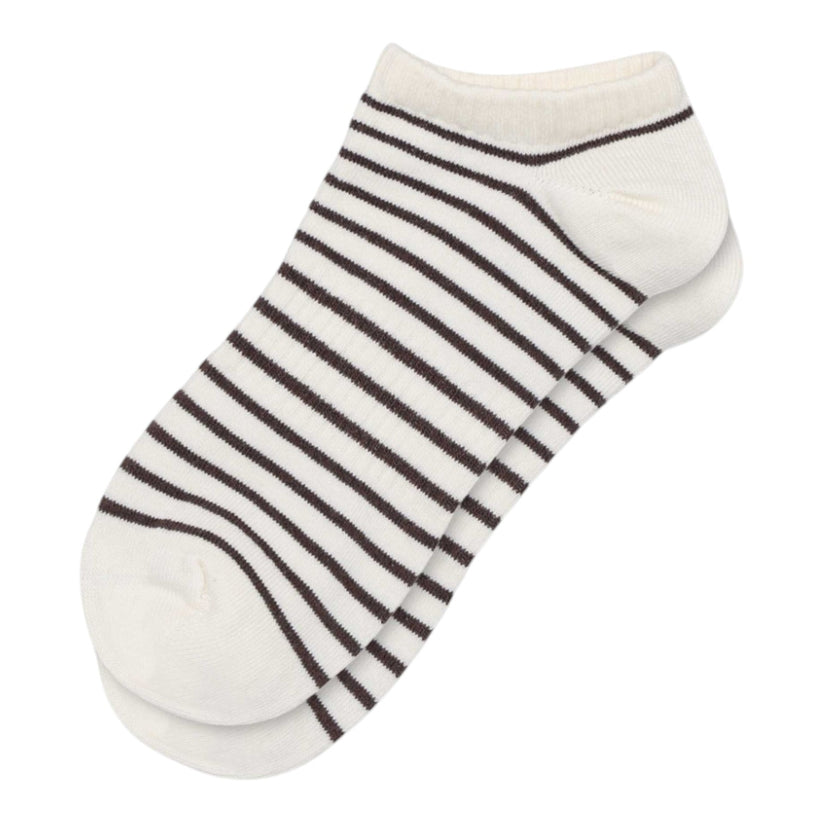 Disse ankelstrømper er designet med et klassisk stribet mønster i farverne creme og taupe, hvilket giver et tidløst udtryk. Den diskrete ribkant sikrer, at strømperne sidder behageligt og tæt omkring anklen uden at stramme.