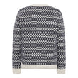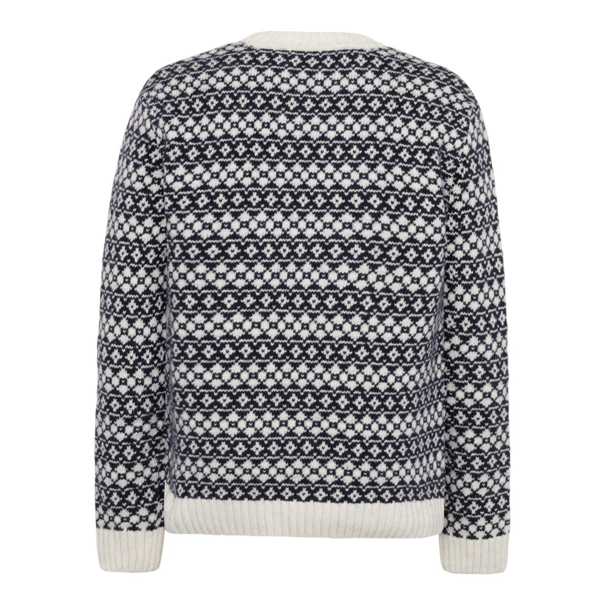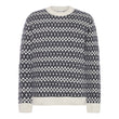 Den enkle rundhals og ribkanter ved halsudskæring, manchetter og bund giver et rent finish, mens mønsterets fine detaljer gør pulloveren til en statement-model i vintergarderoben.