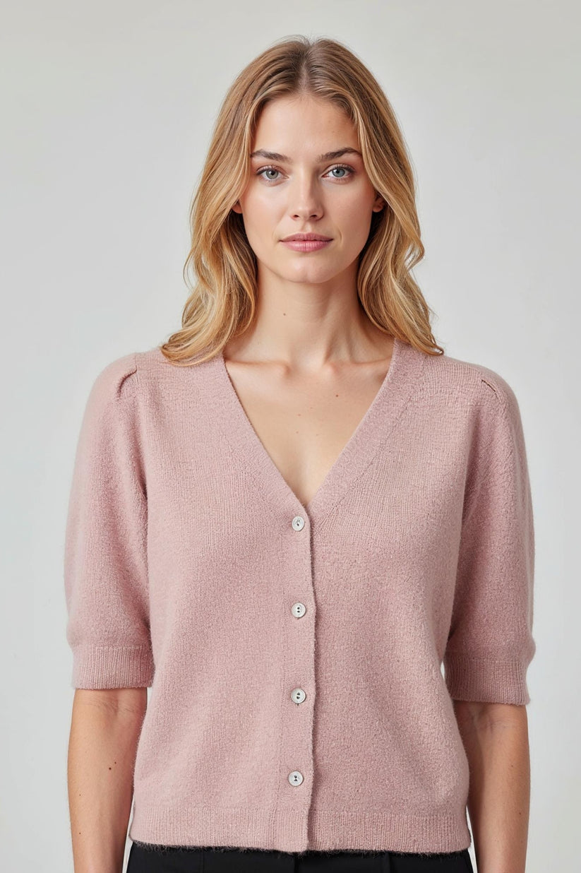 Balvi Cardigan er en blød og let cardigan med korte ærmer. Den er strikket i en luksuriøs blanding af alpaka, merinould, polyamid og elastan, hvilket giver en behagelig pasform og et elegant fald.