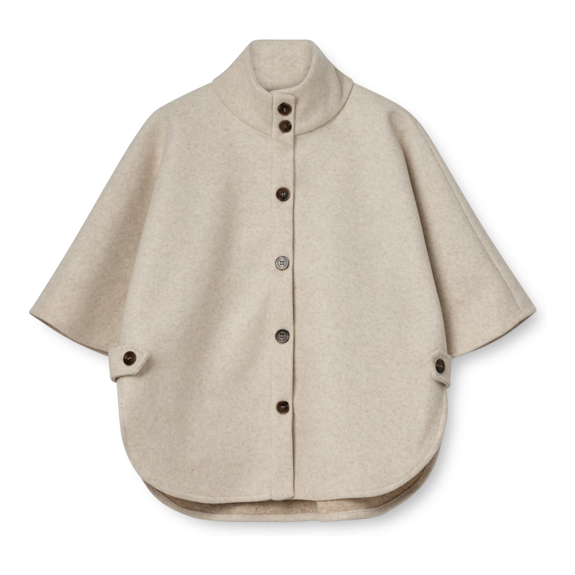 Denne elegante poncho er designet til at give et sofistikeret og tidløst udtryk. Den løse pasform og korte ærmer skaber et let og feminint fald, mens den høje krave og gennemgående knaplukning tilfører struktur og klassisk stil.