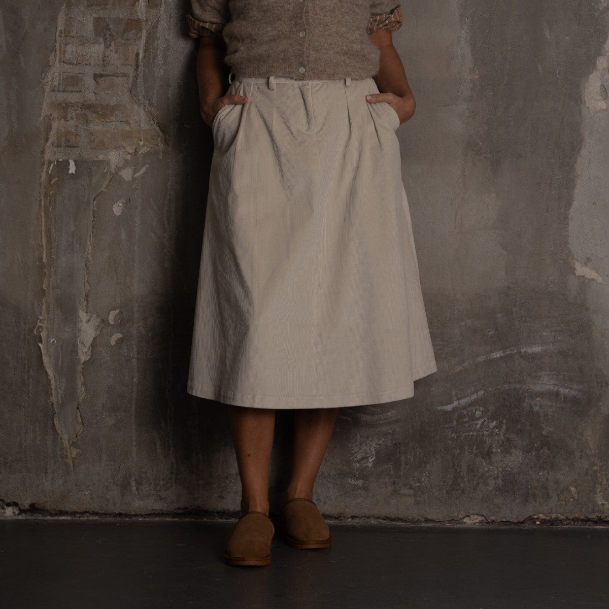 Kyoto Nederdel er en stilren klassiker i blød fløjl, der kombinerer et enkelt udtryk med funktionelle detaljer. Nederdelen er udstyret med to praktiske lommer, bæltestropper og en diskret knaplukning, som giver både komfort og et elegant look. Perfekt til hverdagsbrug, hvor du ønsker en afslappet, men sofistikeret stil.