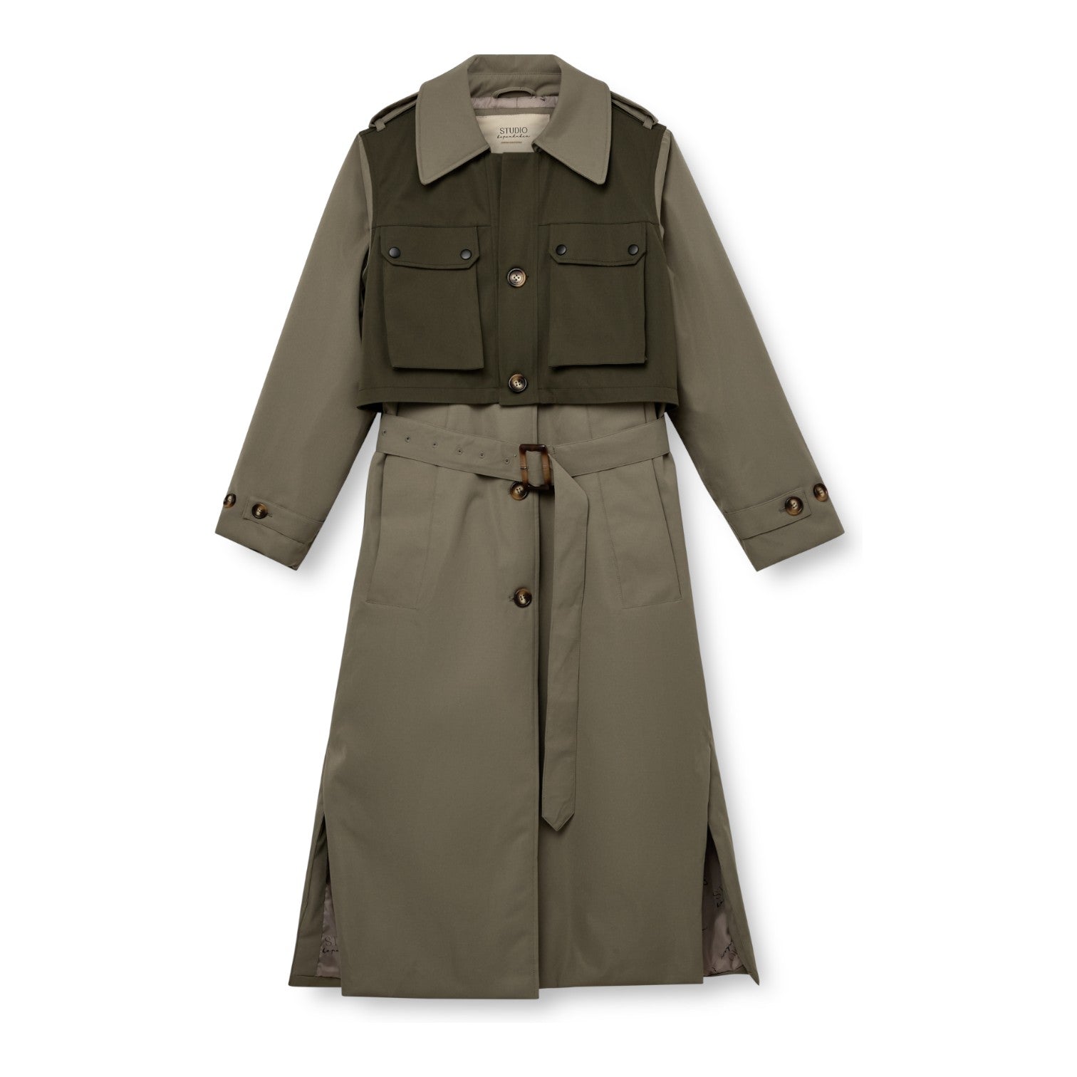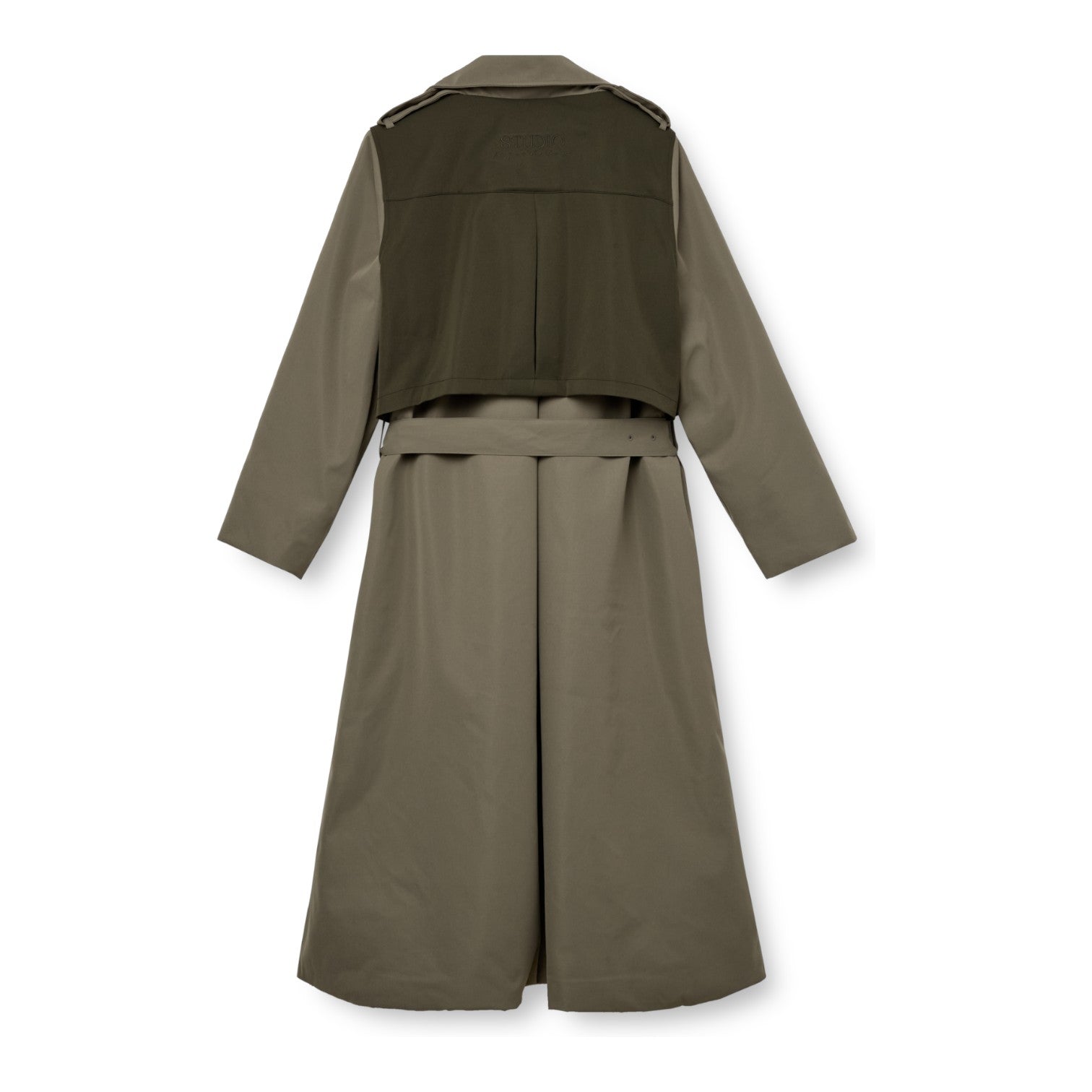 Jakken har bælte i taljen, skulderremme, en påsyet vest og fire praktiske lommer med knappelukning foran. På ryggen prydes den af et lille broderet logo, der fuldender det enkle, skandinaviske udtryk.