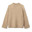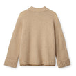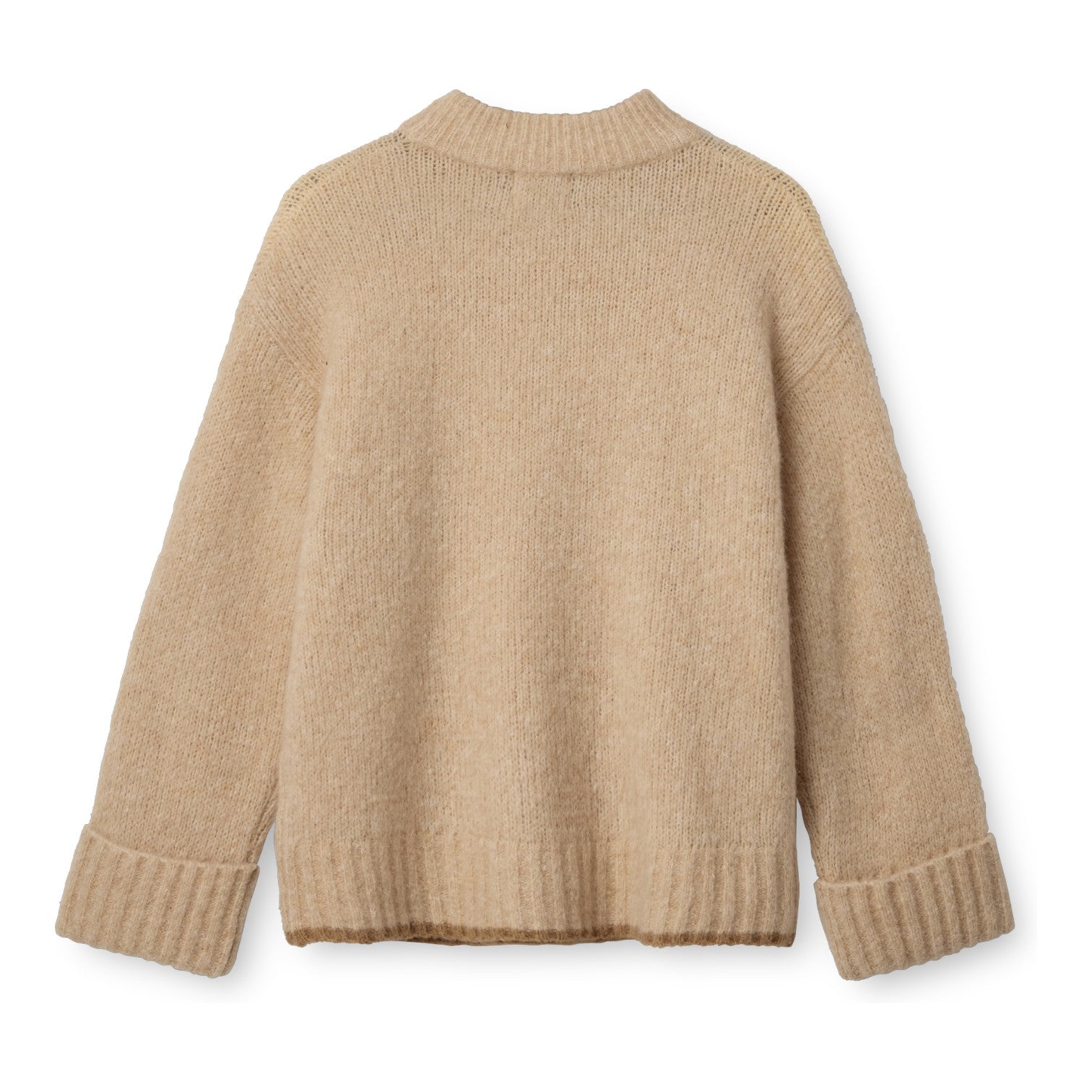 Studio uld strik med rund hals, bred rib både forneden og i ærmerne. På ærmerne er ribkanten bukket op og løs ved håndleddet.