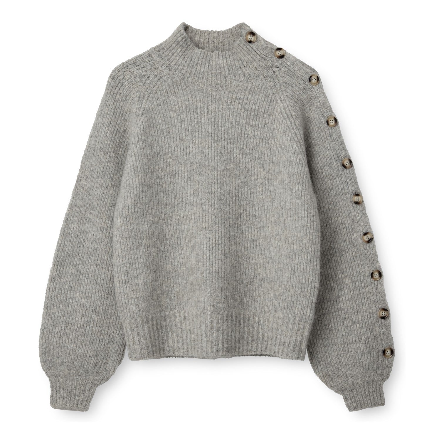 Studio Rullekrave er en blød strik i uld med høj hals og knaplukning ned langs den ene side. Designet er enkelt og funktionelt med fokus på komfort og varme.